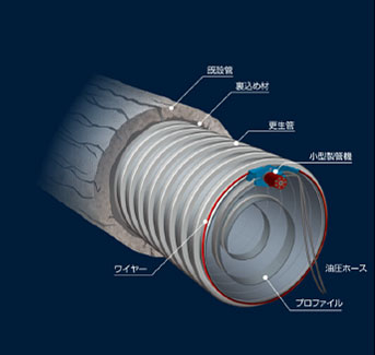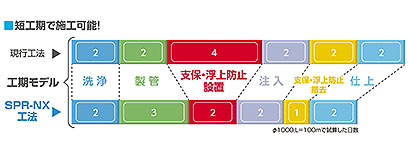 SPR-NX工法は従来のSPR 工法の特徴をそのままに、施工中の流下阻害を低減し工期短縮が可能な複合管更生工法です。