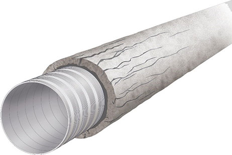 SPR-SE工法は、既設管きょ内にスチール部材で補強された硬質塩化ビニル製の帯状材料(プロファイル)をスパイラル状に篏合しながら更生管を製管します。つぎに、既設管きょと更生管の間隙に間詰め材を充填して自立管を構築する更生工法です。